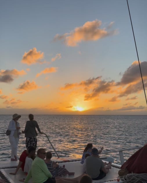 Sitting at the front of a sailing catamaran, watching the sunset, I felt deep gratitude—pure joy and delight in the moment. I found happiness not in the trip’s fun but in the small, everyday wonders like the teens sitting on the catamaran’s netting and talking to each other rather than checking their phones, watching people dance to the sounds of Bob Marley (I had to join in) and taking in the beauty of the sunset.
